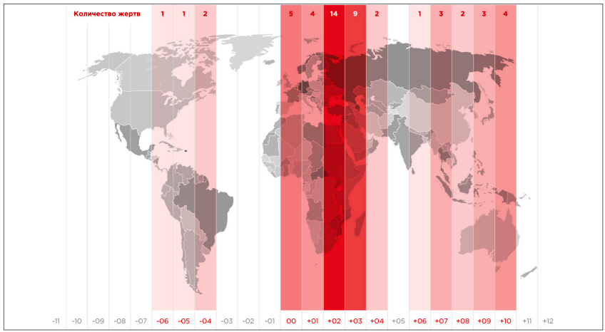 На сегодняшний день под управлением группировки уже более 50 компьютеров² по всему миру, карта часовых поясов атакованных устройств совпадает с традиционной географией интересов группировки.