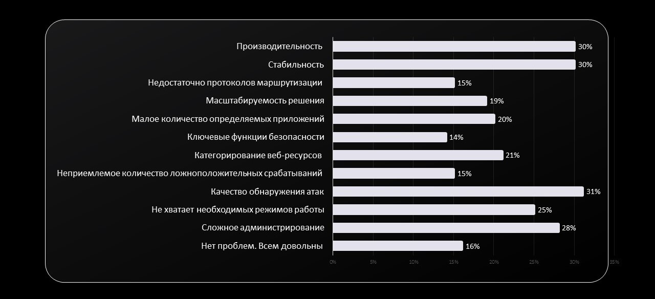 Рынок продуктов next generation firewall (NGFW) претерпел значительные изменения за последние два года. Отечественный рынок покинули зарубежные вендоры, и клиенты начали оценивать возможность перехода на российские решения. При этом согласно результатам исследования Positive Technologies, 30% российских специалистов по ИТ и ИБ считают производительность межсетевых экранов нового поколения низкой и еще 30% не удовлетворены стабильностью решений. Также треть респондентов выделили плохое качество обнаружения кибератак (31%) и сложное администрирование (28%).