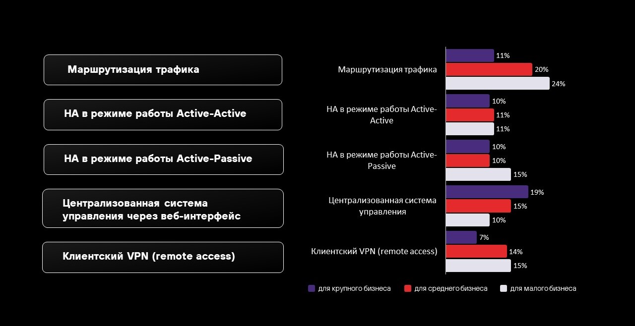 NGFW — это продукт на стыке информационной безопасности и информационных технологий. Согласно исследованию, среди главных функций ИБ межсетевого экрана нового поколения — контроль приложений, пользователей и система предотвращения вторжений (IPS). А в ИТ-функциях — маршрутизация трафика, централизованное управление через веб-интерфейс и кластер высокой доступности.
