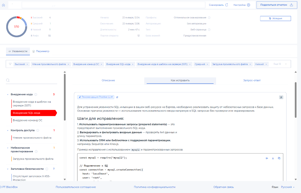 Обновленный PT BlackBox Scanner помогает разработчикам эффективно устранять уязвимости на сайтах и в веб-приложениях. Теперь в дополнение к подробному отчету, включающему результаты более 110 видов проверок, сервис, используя возможности искусственного интеллекта, автоматически формирует рекомендации по устранению найденных дефектов безопасности. В них доступным языком описываются причины появления уязвимостей, а также содержатся примеры корректного кода и конфигураций.