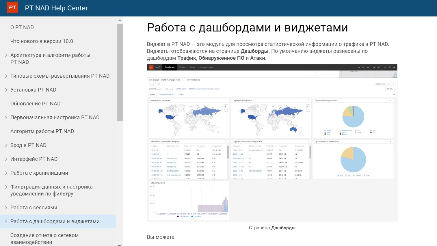 Для удобства работы с PT NAD теперь пользователи могут включить автоматическое обновление данных на дашбордах с заданной периодичностью и из любого раздела системы перейти в справочный центр, аккумулирующий полную и актуальную на любой момент времени информацию по работе с продуктом. В новой вкладке браузера вы получите подробную информацию и инструкции по работе с функцией системы.
