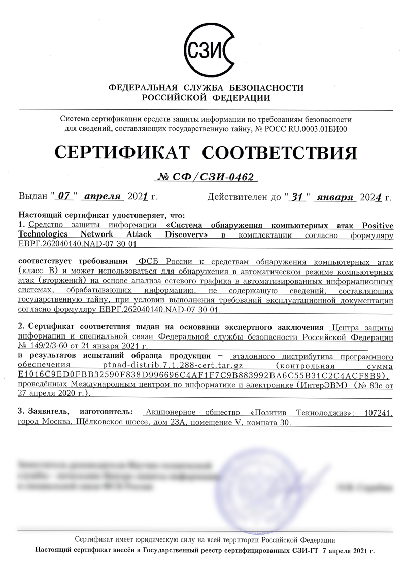 Система анализа трафика PT Network Attack Discovery (PT NAD) успешно прошла сертификационные испытания в системе сертификации ФСБ России. В результате испытаний продукту выдан сертификат соответствия №СФ/СЗИ-0462 от 07.04.2021.