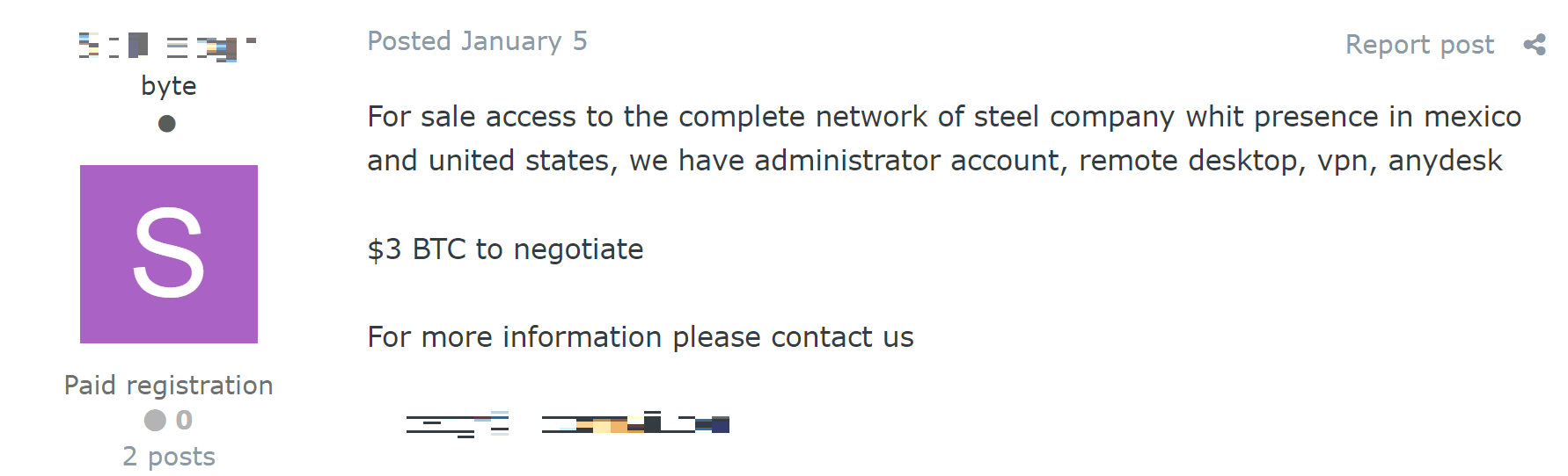 Средняя стоимость доступа в регионе составляет 924 $, что больше показателя за прошлый год в 1,5 раза. Однако среди публикаций в дарквебе было найдено объявление, в котором предлагается купить доступ к инфраструктуре производителя стали за 3 BTC. Если учитывать это объявление, то средняя стоимость доступа вырастает до 1618 $.