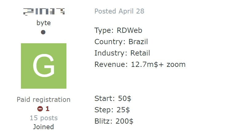 В каждом третьем объявлении (33%) предлагаются доступы по протоколам RDP и VPN. Также регулярно встречаются публикации, в которых представлены доступы с возможностью подключения при помощи программ удаленного доступа (13%), например Citrix и RDWeb, и оболочки Shell (10%). Следует учитывать, что типы доступов, которые предлагаются в дарквебе, определяются не злоумышленниками, а зависят от инфраструктуры компаний, на которые нацелены киберпреступники.