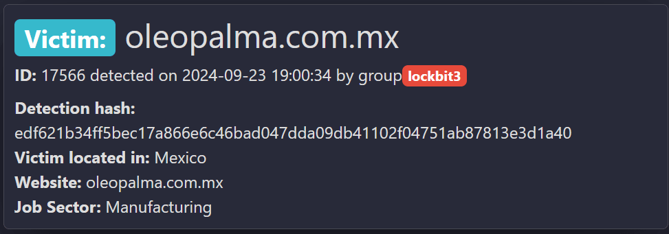 Почти каждая четвертая публикация в дарквебе была связана с группировкой вымогателей LockBit 3.0 (23%). Например, в сентябре 2024 года злоумышленники объявили о том, что была реализована кибератака на мексиканскую промышленную компанию Oleopalma.