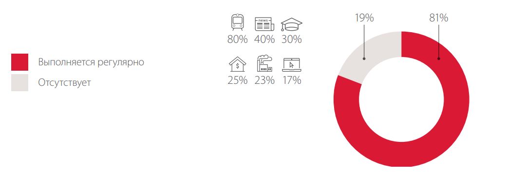 Исследование показало, что банковская отрасль — единственная, в которой 100% компаний принимают меры по обучению сотрудников основам ИБ. В этом основная заслуга требований Банка России и международного стандарта PCI DSS, обязывающих проводить работу с персоналом по обучению и повышению осведомленности в вопросах информационной безопасности.
