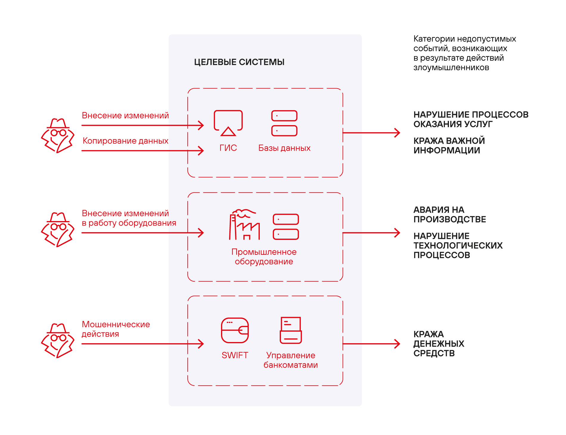 - Недопустимые события формулировались индивидуально для каждой организации с указанием значений недопустимого ущерба. В рамках исследования мы объединили такие события в перечисленные категории.